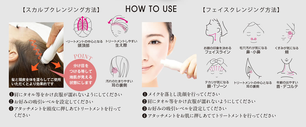 水道水OK | ヘッドスパにも使える | 皮脂を分解吸引 | パワーで色が変わるLED |